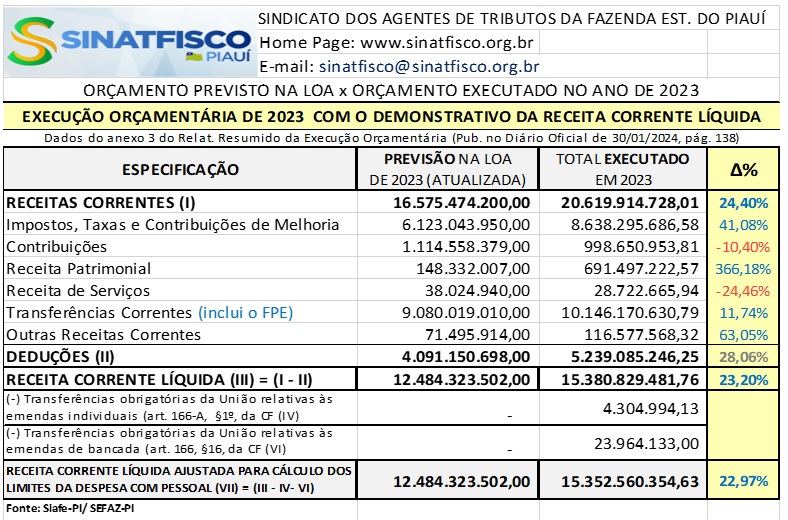 O presidente da instituição, Augusto Müller, se diz surpreso com a realização dessa reunião, uma vez que recebeu um ofício com a convocação, mas foi somente para o dia 22/02. “É realmente uma pena, pois gostaríamos de discutir com o Governo algumas questões. Por exemplo, consideramos que o Estado conta com bons indicativos financeiros. Sabemos que o orçamento executado em 2023, no que tange às receitas correntes, superou as expectativas, as previsões contidas na Lei Orçamentária Anual (LOA). O resultado executado foi 24,40% a mais que o previsto na LOA”, informa Müller, que se refere aos dados do Relatório Resumido da Execução Orçamentária de 2023, publicado no diário oficial do dia 30/01/2024, no qual se faz o Demonstrativo da Receita Corrente Líquida, como se mostra de forma sintética na tabela a seguir: