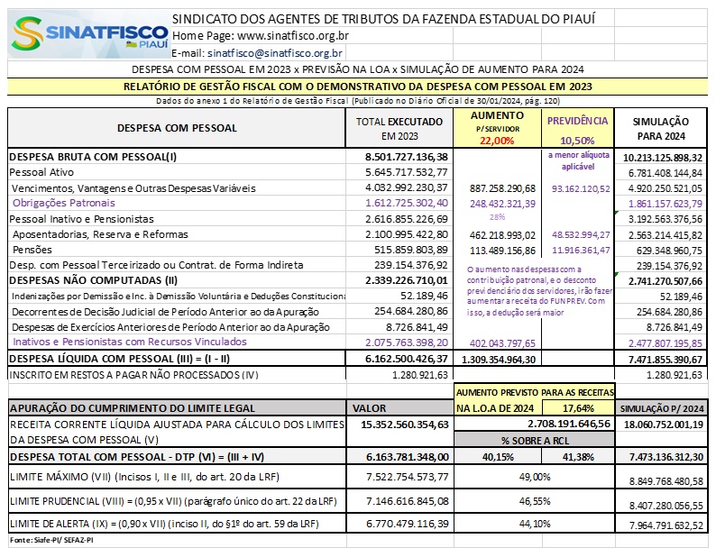 Outro fato que comprova a boa saúde financeira do Estado, de acordo com os sindicalistas, é que as despesas com pessoal estão em um nível bem abaixo do limite mínimo exigido pela Lei de Responsabilidade Fiscal (LRF). No Relatório de Gestão Fiscal, onde se faz o Demonstrativo da Despesa com Pessoal (resumido na tabela abaixo), consta o percentual de gasto em 40,15% da Receita Corrente Líquida, sendo que o primeiro limite da LRF, o de alerta, é de 44,10% e o máximo, de 49%. Outro detalhe importante é que a LOA para 2024, que foi publicada no dia 27/12/2023, prevê Receitas Correntes 17,64% superiores àquelas previstas para 2023. Sendo assim, segundo o Sindicato, para o Governo conceder os 22% de aumento para os servidores, e ainda permanecer num patamar confortável em relação aos limites impostos pela LRF, ao que parece, só falta mesmo boa vontade. “Que o Governador possa levar em conta também o recorde da arrecadação própria neste início de ano. Pela primeira vez na história, chegou-se à cifra de 1 BILHÃO de reais arrecadados em um único mês. Um crescimento de 33% em relação a janeiro do ano passado. Os servidores precisam da recomposição salarial para continuarem arcando com os seus compromissos financeiros, fazendo a ‘roda da economia girar’, e assim favorecendo até mesmo uma maior arrecadação de tributos pelo Estado”, finaliza o Presidente Müller.